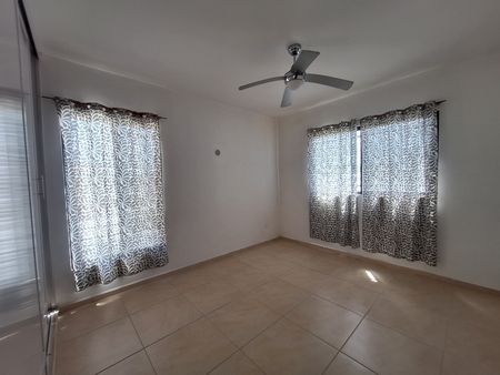 Recamara secundaria con cortinas, ventilador, aire acondicionado y closet completamente vestido.