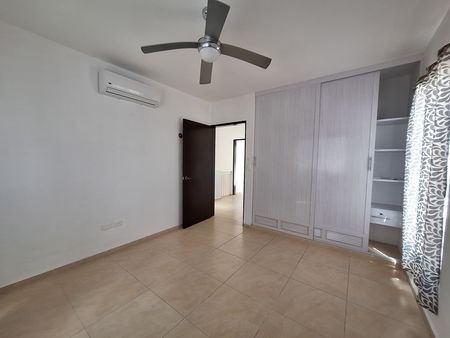 Recamara principal con closet completamente vestido, aire acondicionado , ventilador, cortinas y terraza sin techar.