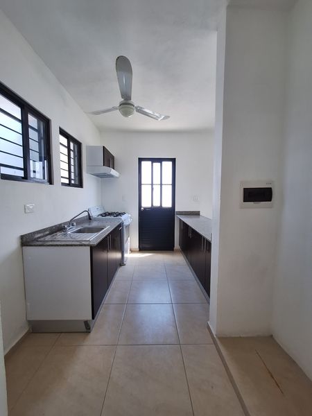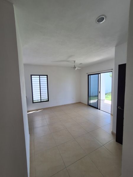 Comedor con ventilador, y con puerta de acceso de cristal hacia terraza trasera.